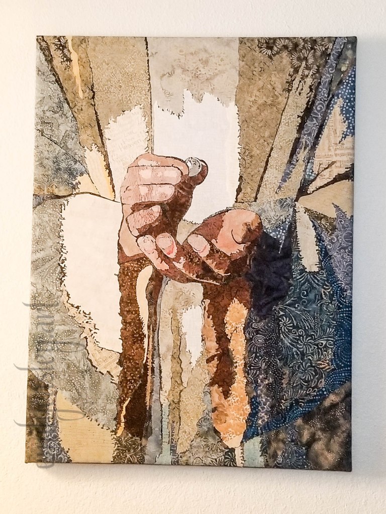 Slowly, I pinned the pieces on a canvas as the image came together and the process took about a month to complete. If you get a chance to look at this piece in person at Bridgeway Christian Church, look closely at the hands in this piece, and you will see hidden words. (In the white portions.)